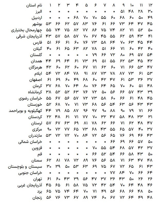 جدول ۲: درصد مشارکت رای دهندگان در هر استان در ۱۲ دوره انتخابات مجلس شورای اسلامی